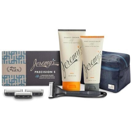 Jeremy’s Razors for Men, Precision 5 Shaving Kit, 4 Razor Cartridges, Shave Cream 6oz with Aloe + Cocoa Butter, Post Shave Balm 3.4oz, Ergonomic Grip Handle, Travel Bag, 8 Piece Set