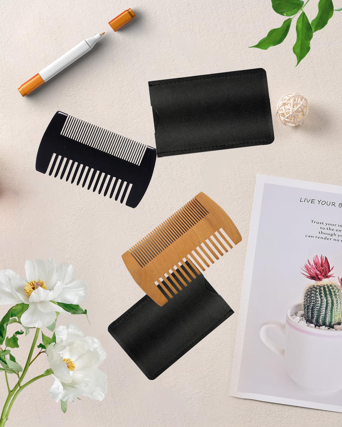 4 Pack Double-Sided Pocket Comb, Wooden Dual Action Beard and Mustache Comb Set with Leather Cases for Beards and Mustaches, Everyday Styling Comb For Detangling Knots, Beard Care & Grooming