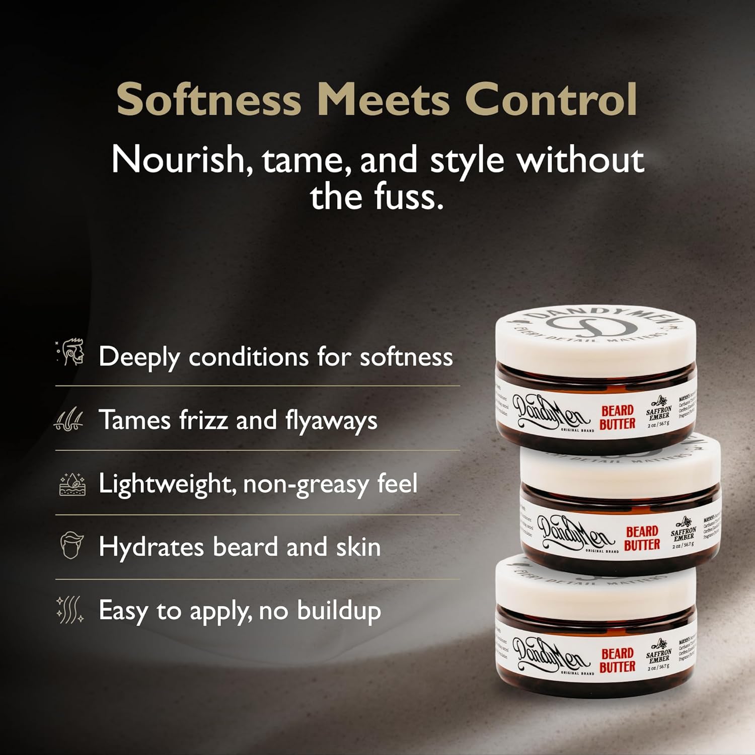 DandyMen Co. Beard Butter truly stands out in the crowded market of beard care products. Its unique formulation of Shea Butter and Argan Oil penetrates deeply to hydrate and soften even the coarsest of beards. The butter controls frizz and flyaways, making it easier to shape and style your beard for a polished look. It absorbs quickly without leaving a greasy residue, ensuring your beard feels natural and soft to the touch. Overall, this product offers great performance, quality, ease of use, and value for money.