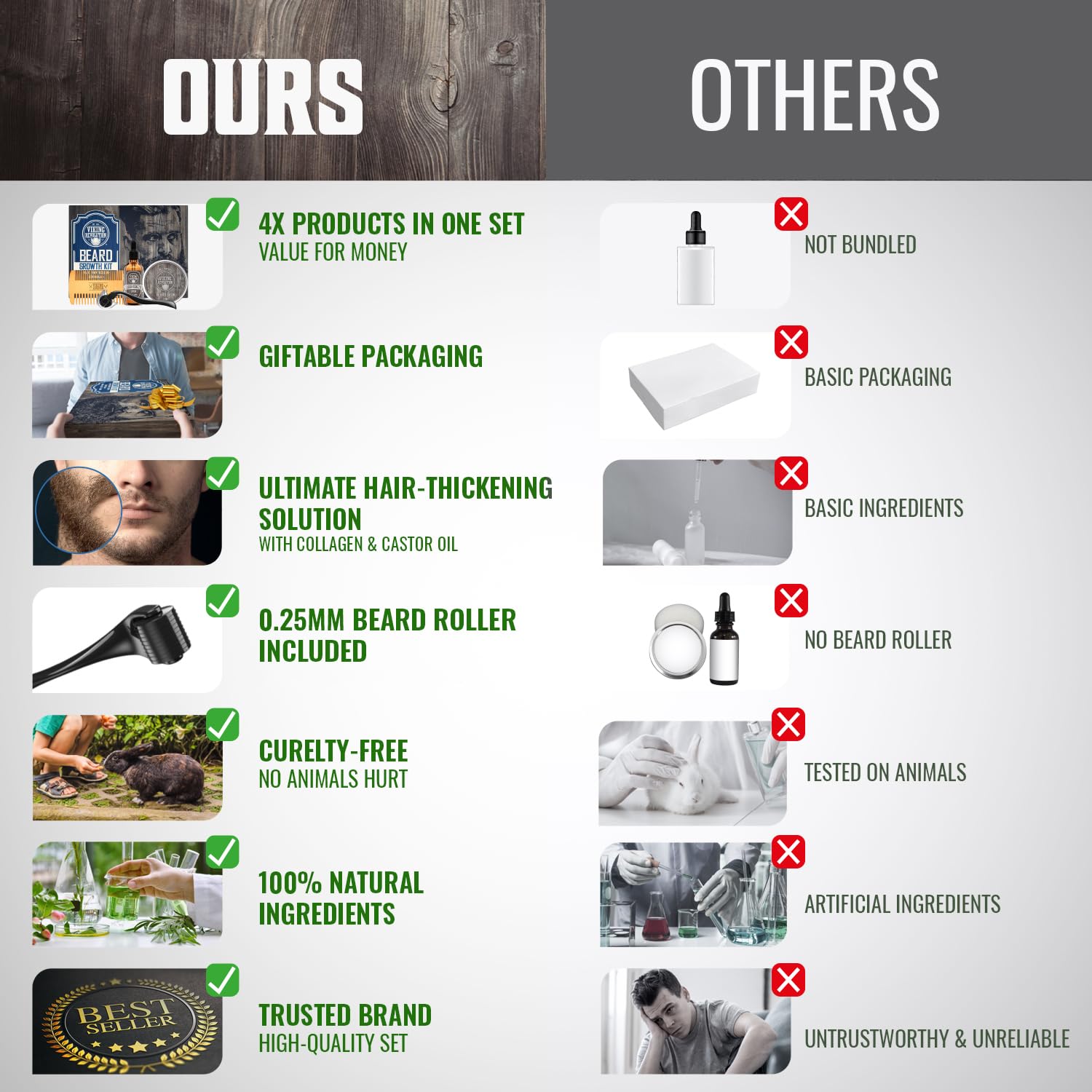 – Beard Growth Kit includes Beard Growth Serum (2oz), Beard Growth Oil Balm (Citrus, 2oz), Wooden Comb, and 0.25mm Beard Growth Roller