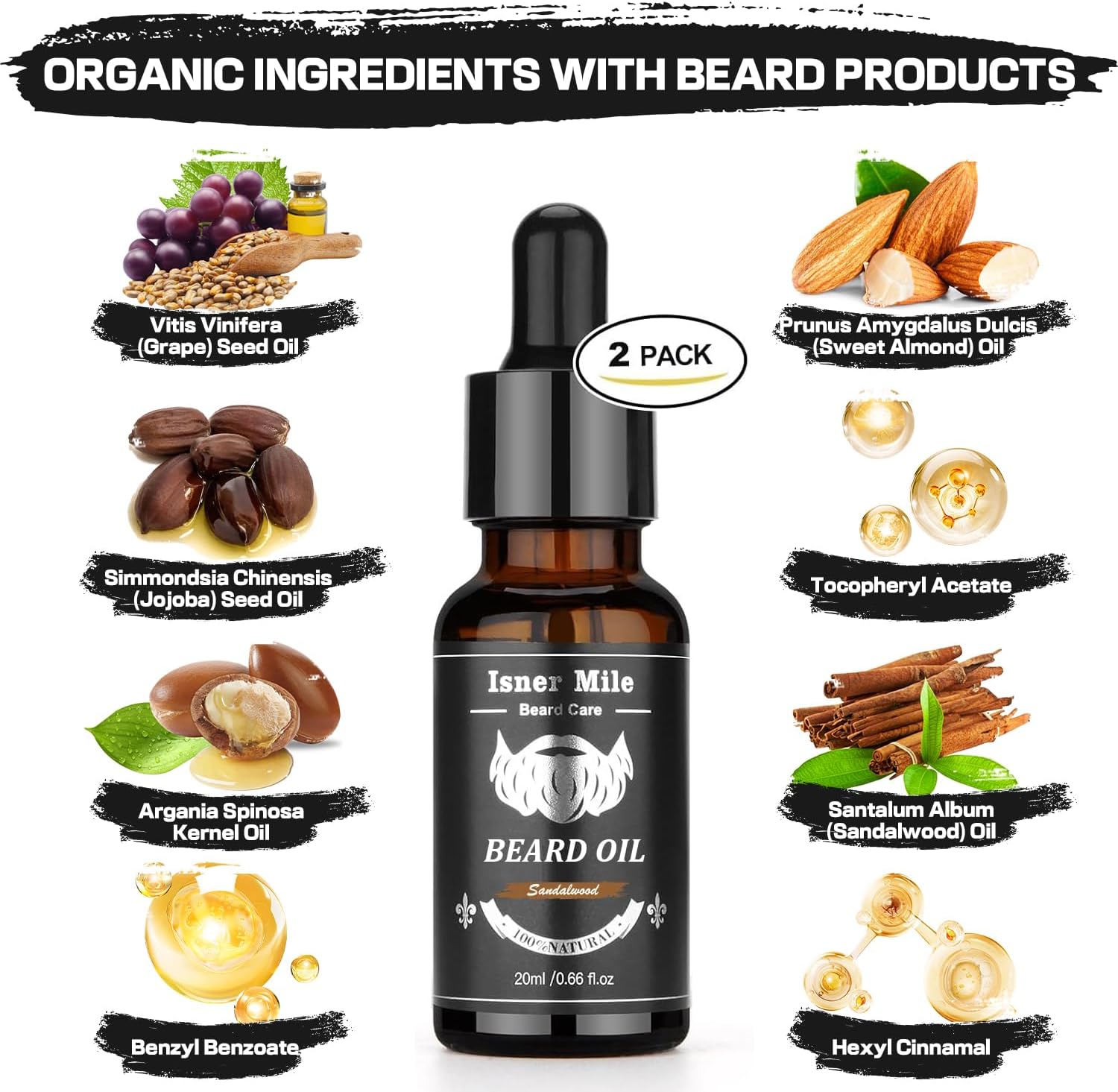 – Beard Oil: Softens and moisturizes the beard with Sweet Almond Oil and Sandalwood Oil