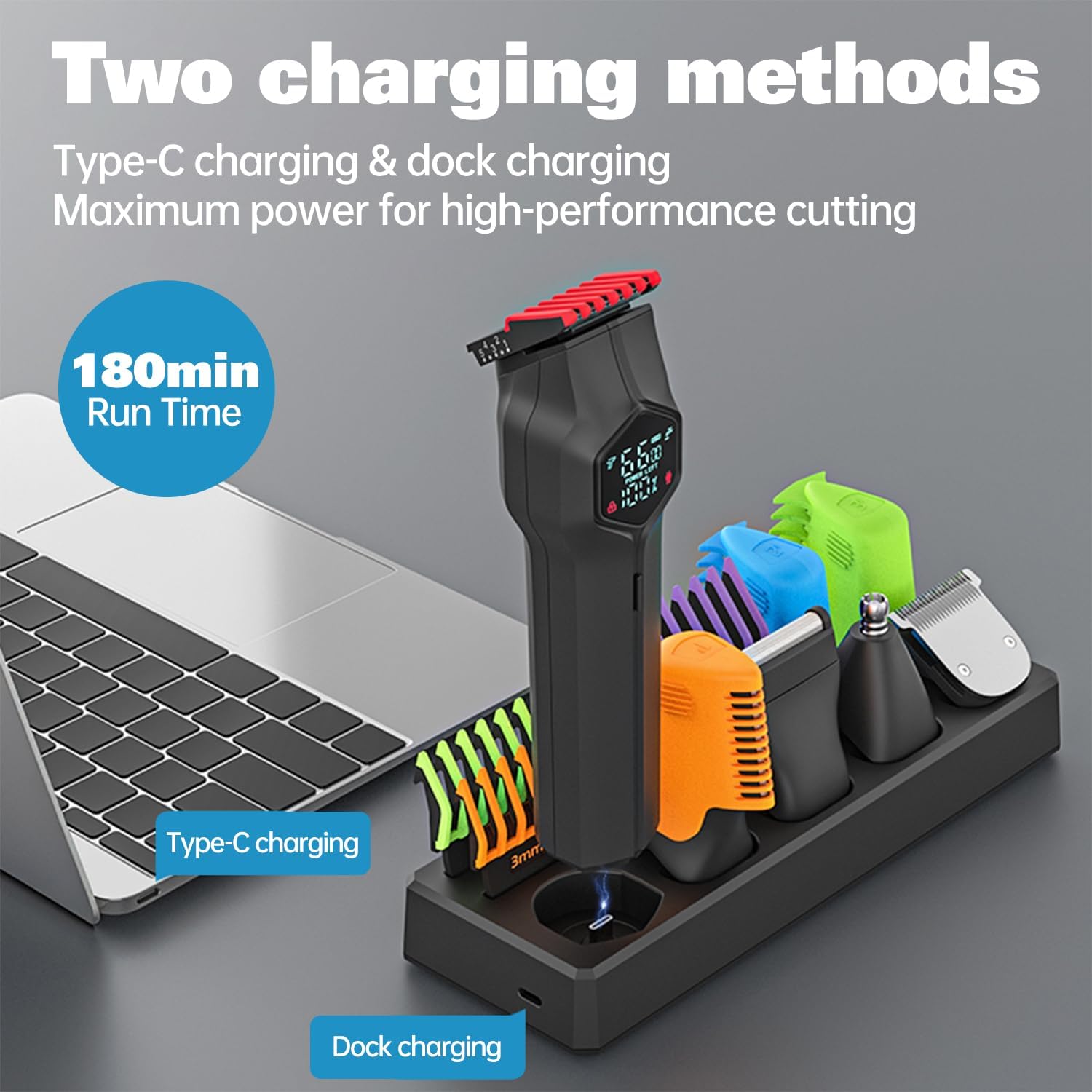 • 7 trimmer heads, 10 combs, and base included