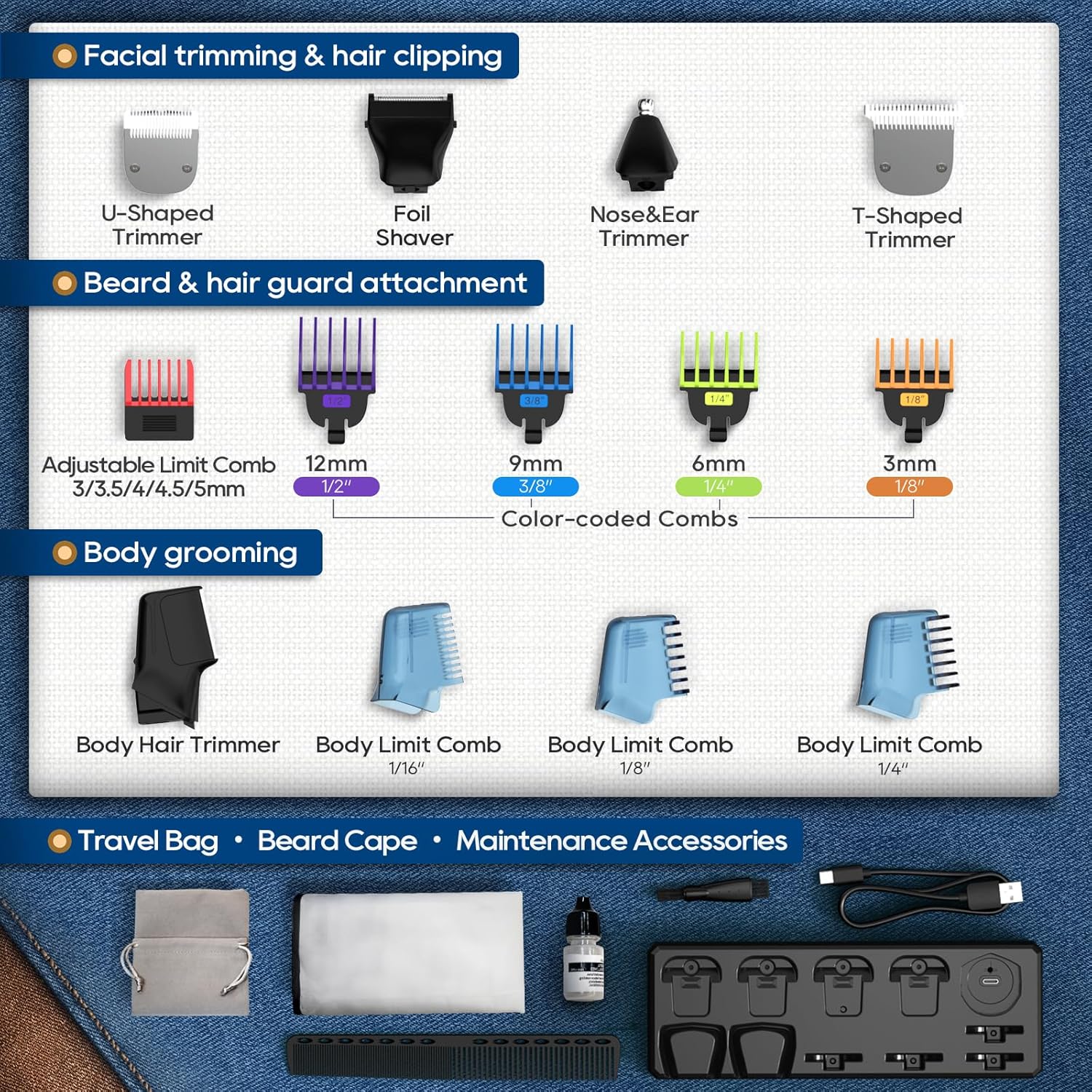 - Color-coded comb for quick length adjustments