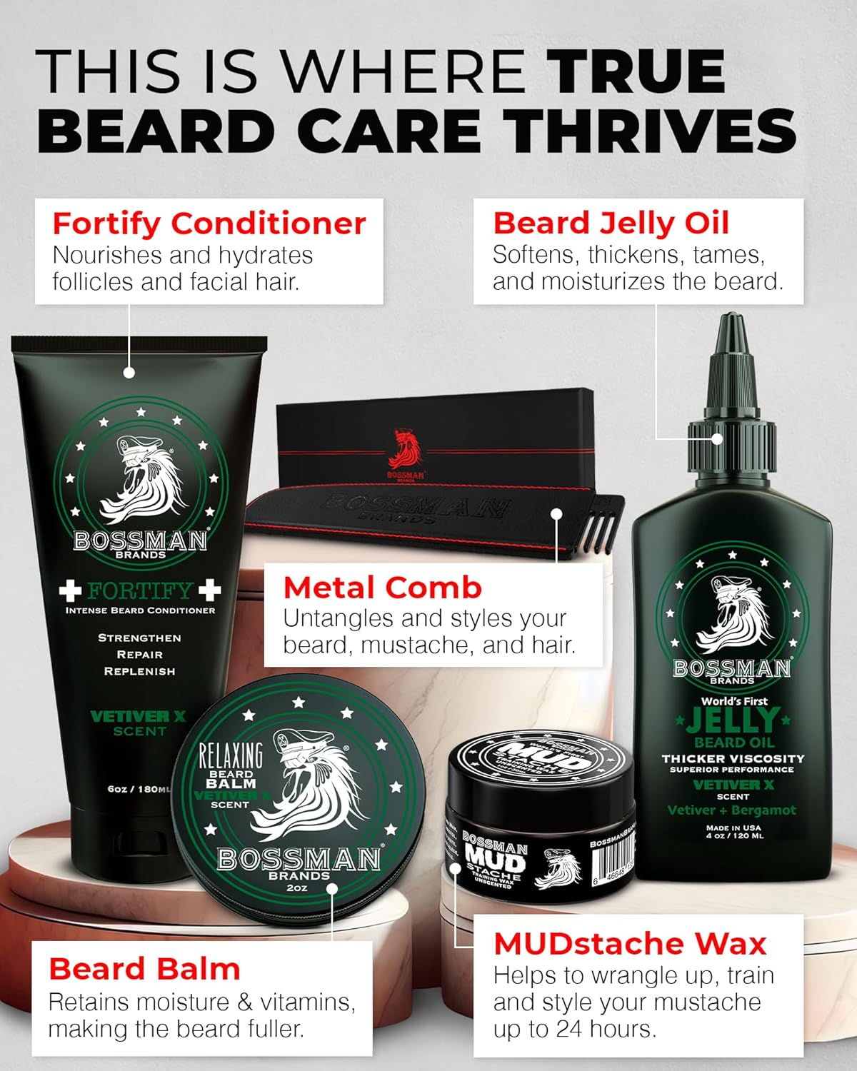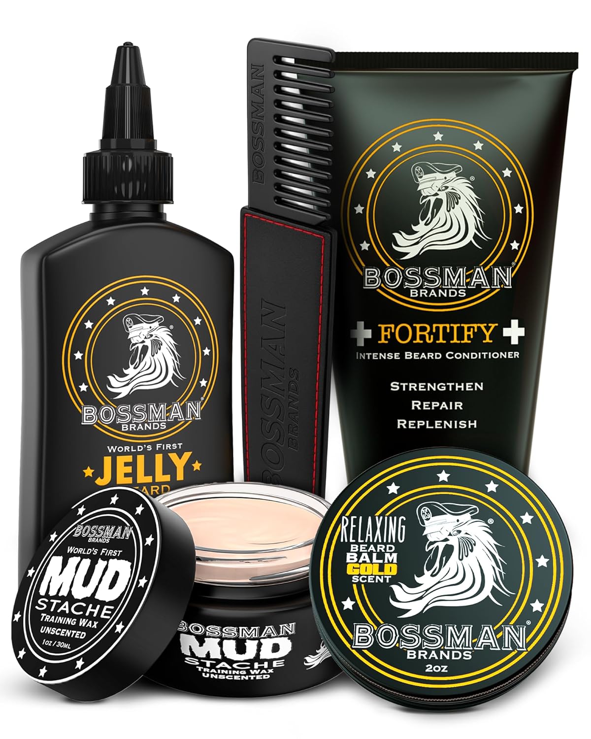 • Includes Fortify Intense Beard Conditioner, Jelly Beard Oil, Relaxing Beard Balm, MUDstache Training Wax, and Metal Beard Comb
