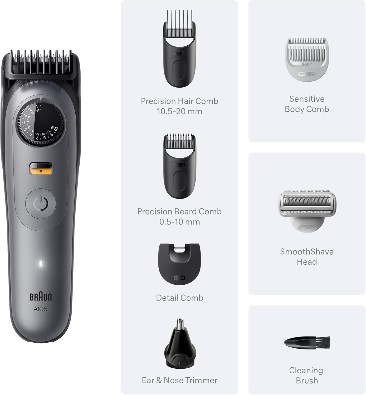 - Effortless grooming for beard, hair, ears, nose, and body