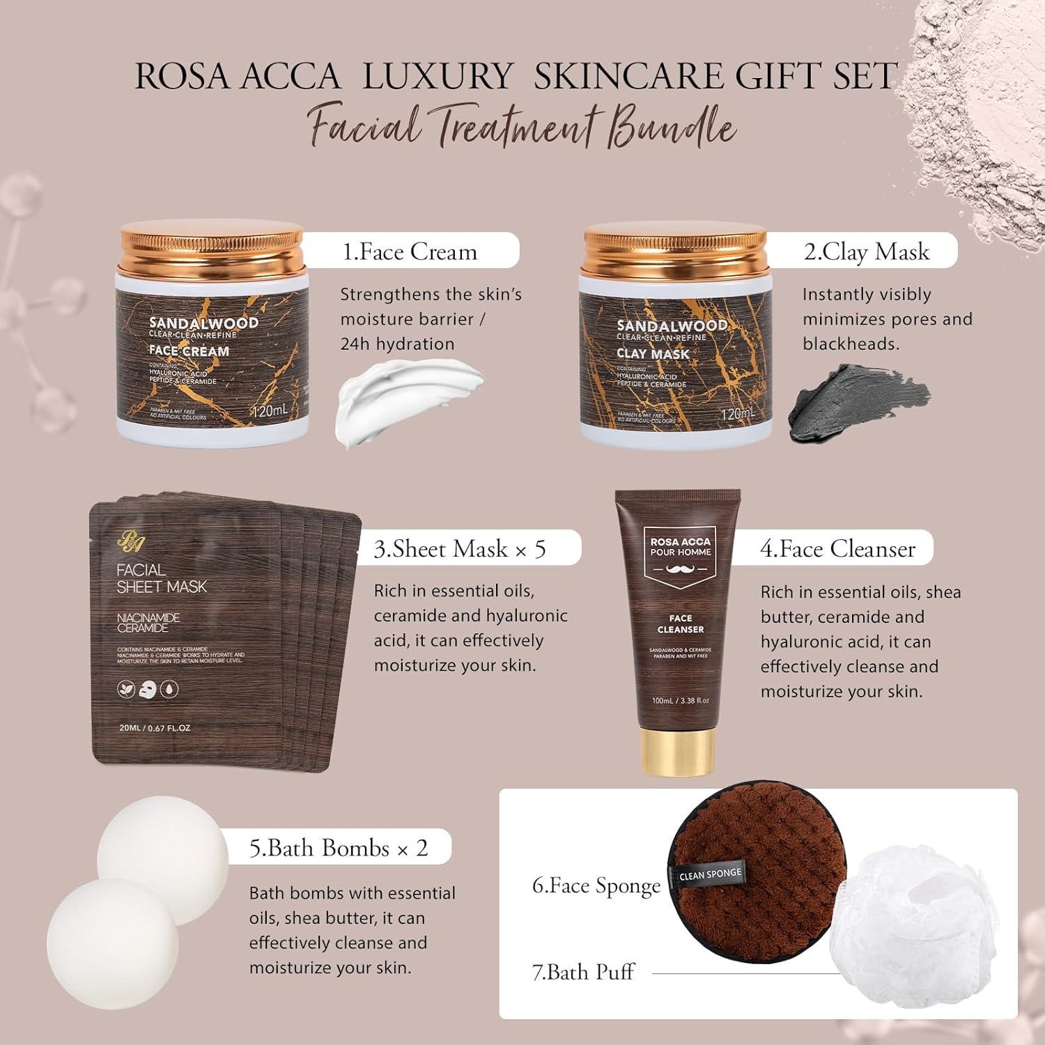 – Includes face cream, clay mask, sheet masks, serums, oils, bath products, and more