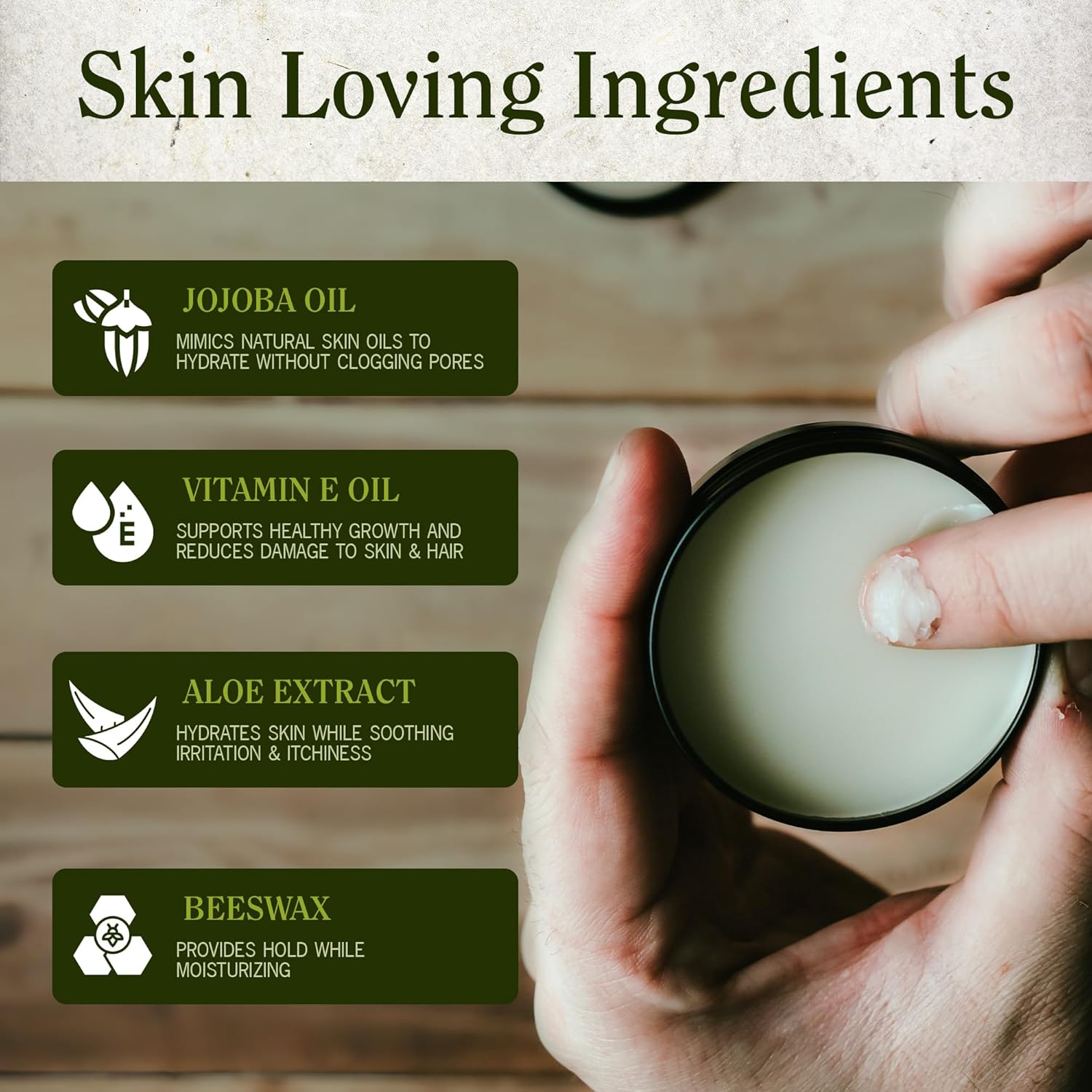 – Natural ingredients including coconut oil, almond oil, argan oil, jojoba oil, beeswax, aloe extract, and vitamin E