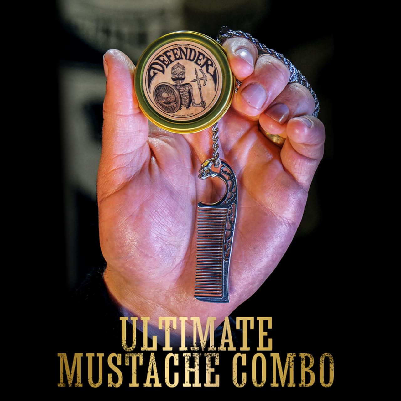 Enhance Your Grooming Game with the Death Grip Defender Mustache Balm + Metal Necklace Mustache Comb Combo Kit