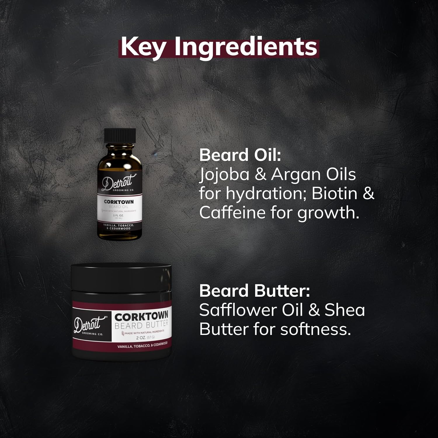 Detroit Grooming Co. Beard Oil & Beard Butter Bundle – Corktown (Vanilla, Tobacco & Cedarwood Scent) – Beard Hydration Set with Vitamin E & Sunflower Oil