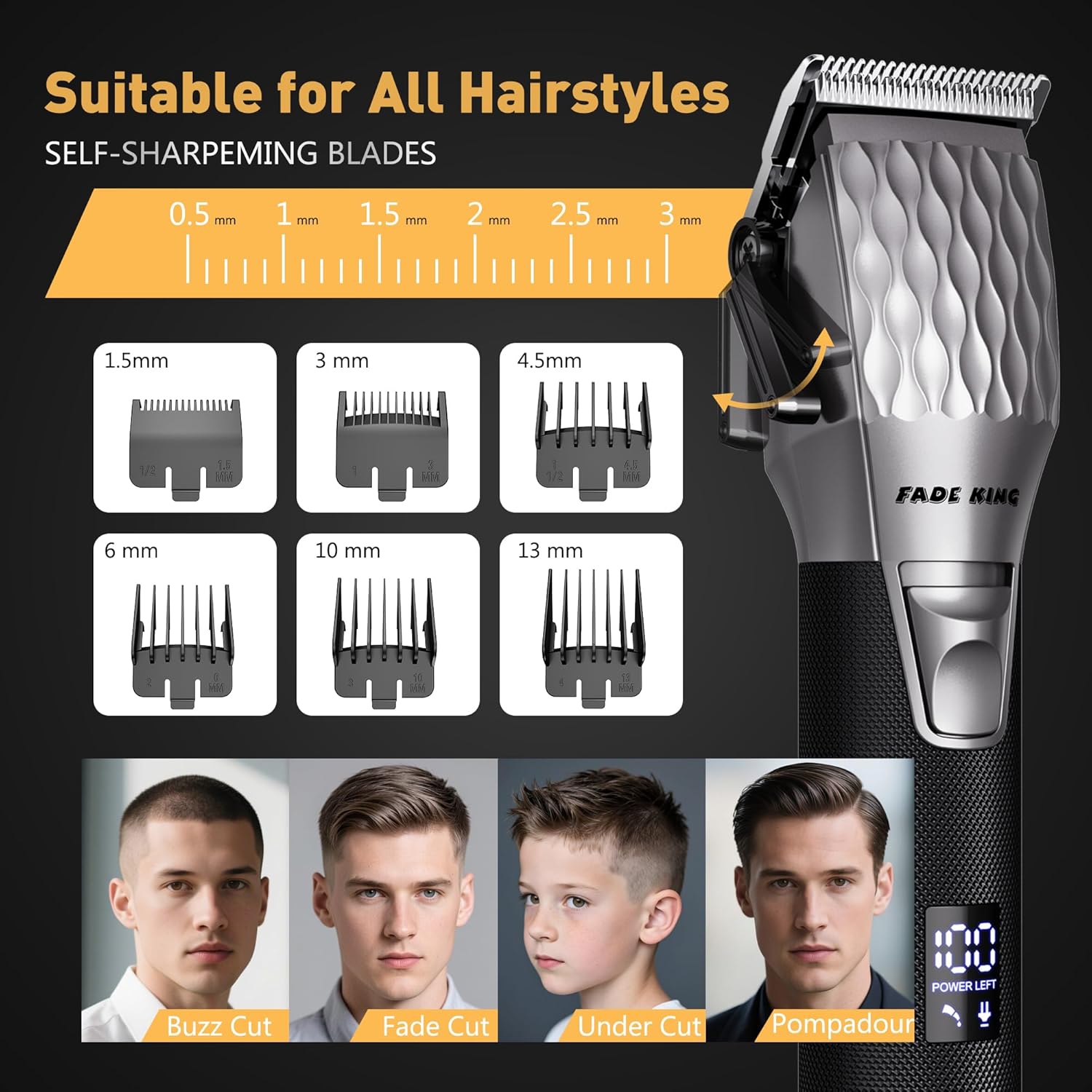 The FADEKING Hair Clippers for Men are perfect for home barbers and professionals looking for a reliable and efficient grooming tool. Whether you’re a beginner or a seasoned stylist, this hair cutting kit is designed to meet your styling needs with precision and ease.