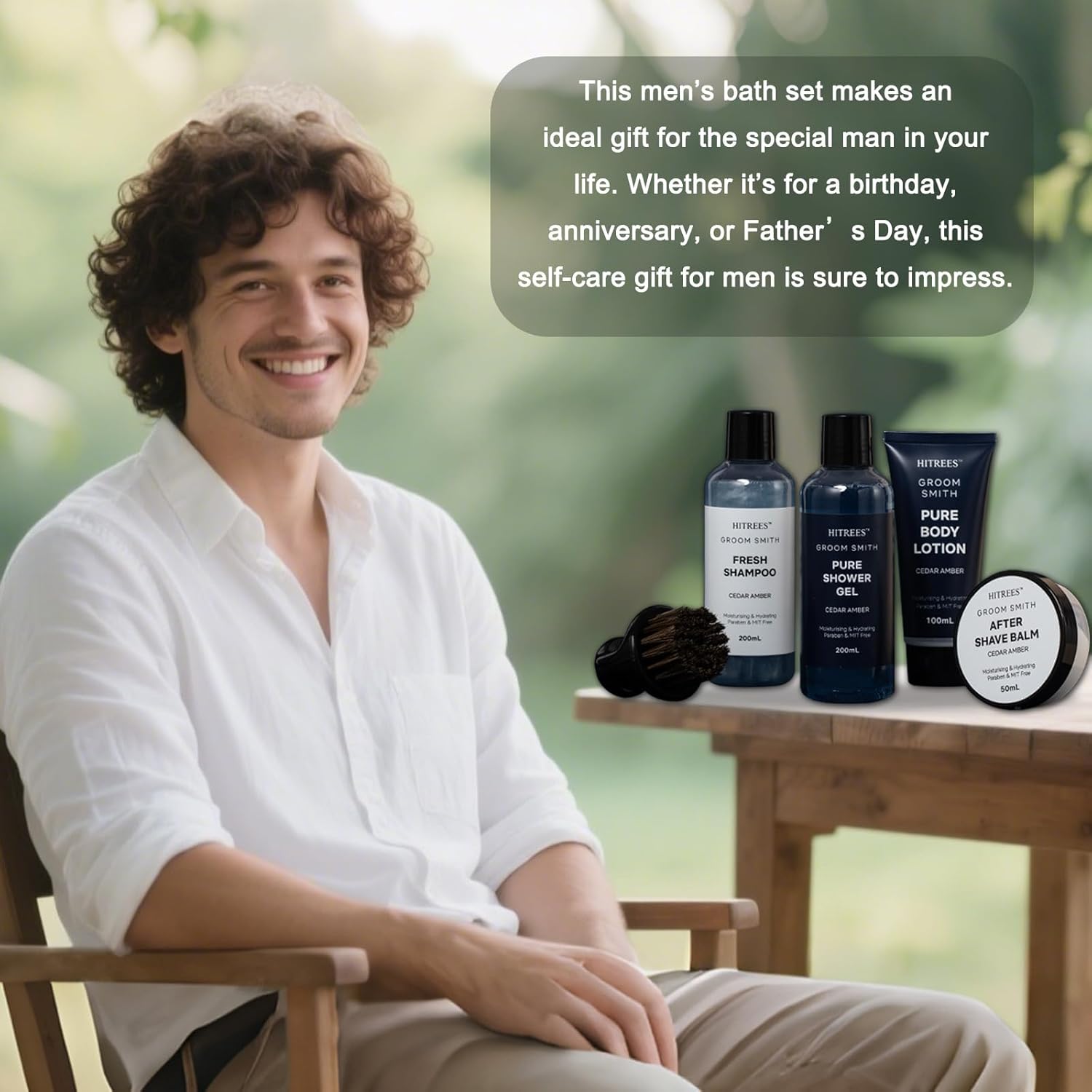 Enhance your grooming routine with the Hitrees For External Use Only care package for men. This spa set includes everything you need for a refreshing and rejuvenating experience, from shower gel to beard brush. The natural formula and Cedarwood & Amber fragrance make this set a perfect gift for the special men in your life.