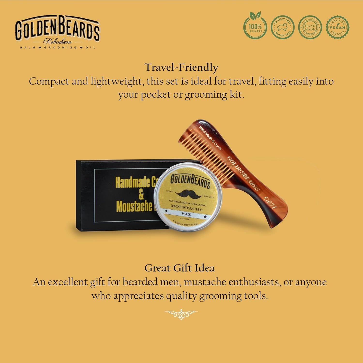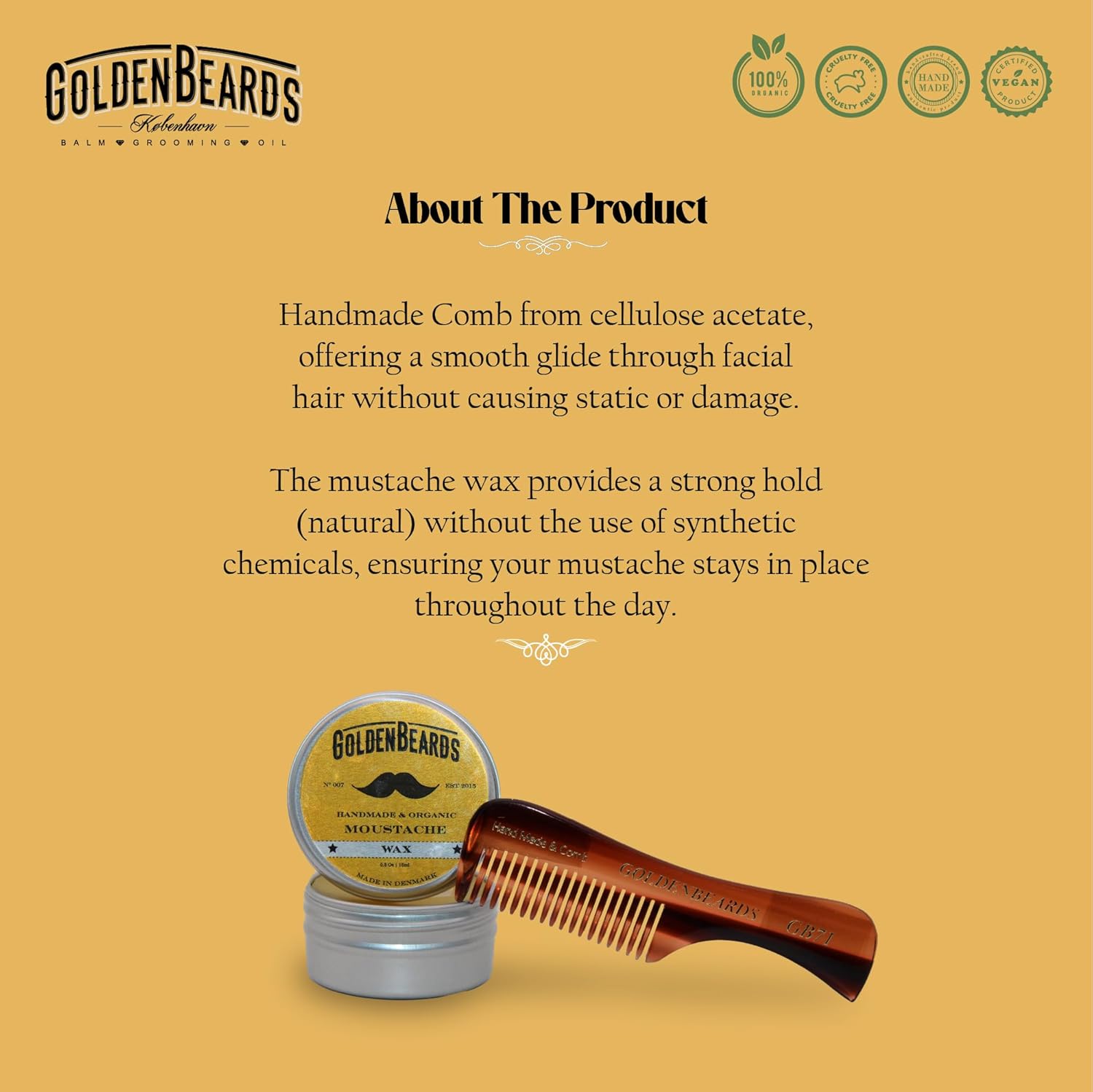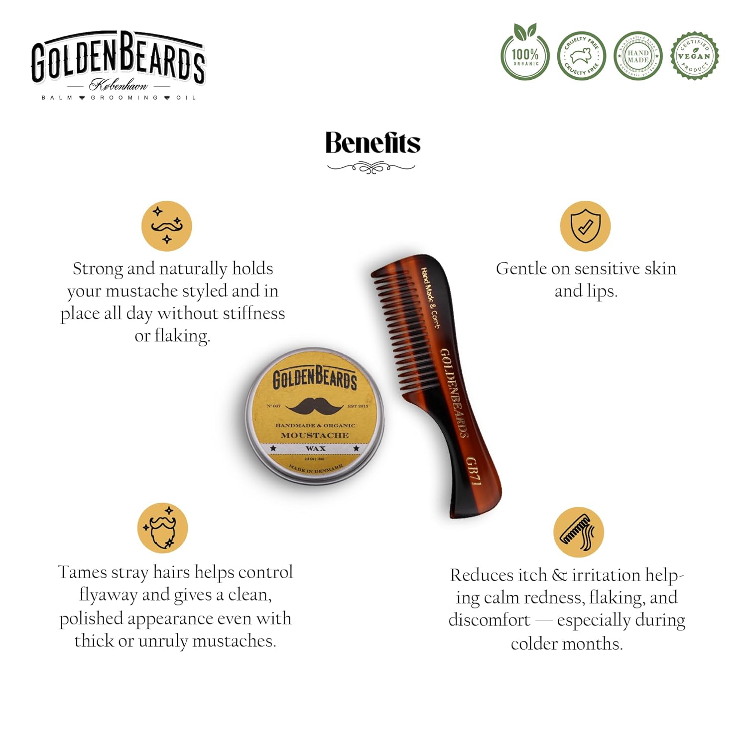 Golden Beards Mustache Wax with GB-71 Comb – Organic & Natural Styling Wax for Men – Strong Hold, Handmade, Vegan, Cruelty-Free Grooming Kit
