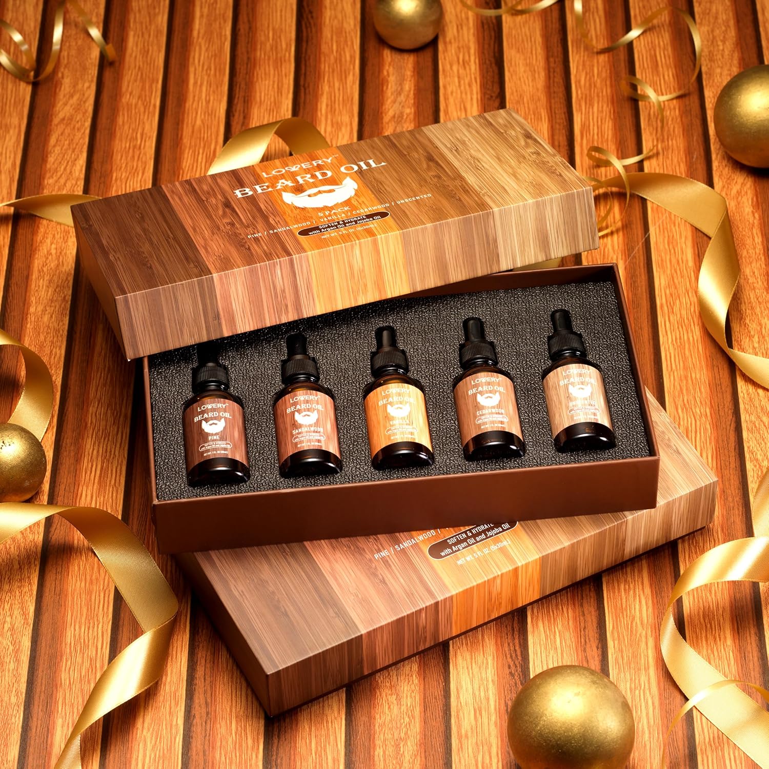 LOVERY (5 Pack Beard Oil for Men, Natural Mens Beard Oil Kit Variety Set – Sandalwood, Vanilla, Cedarwood, Pine, Unscented, W Argan & Jojoba Oil, Mens Beard Softener Grooming Gifts for Him