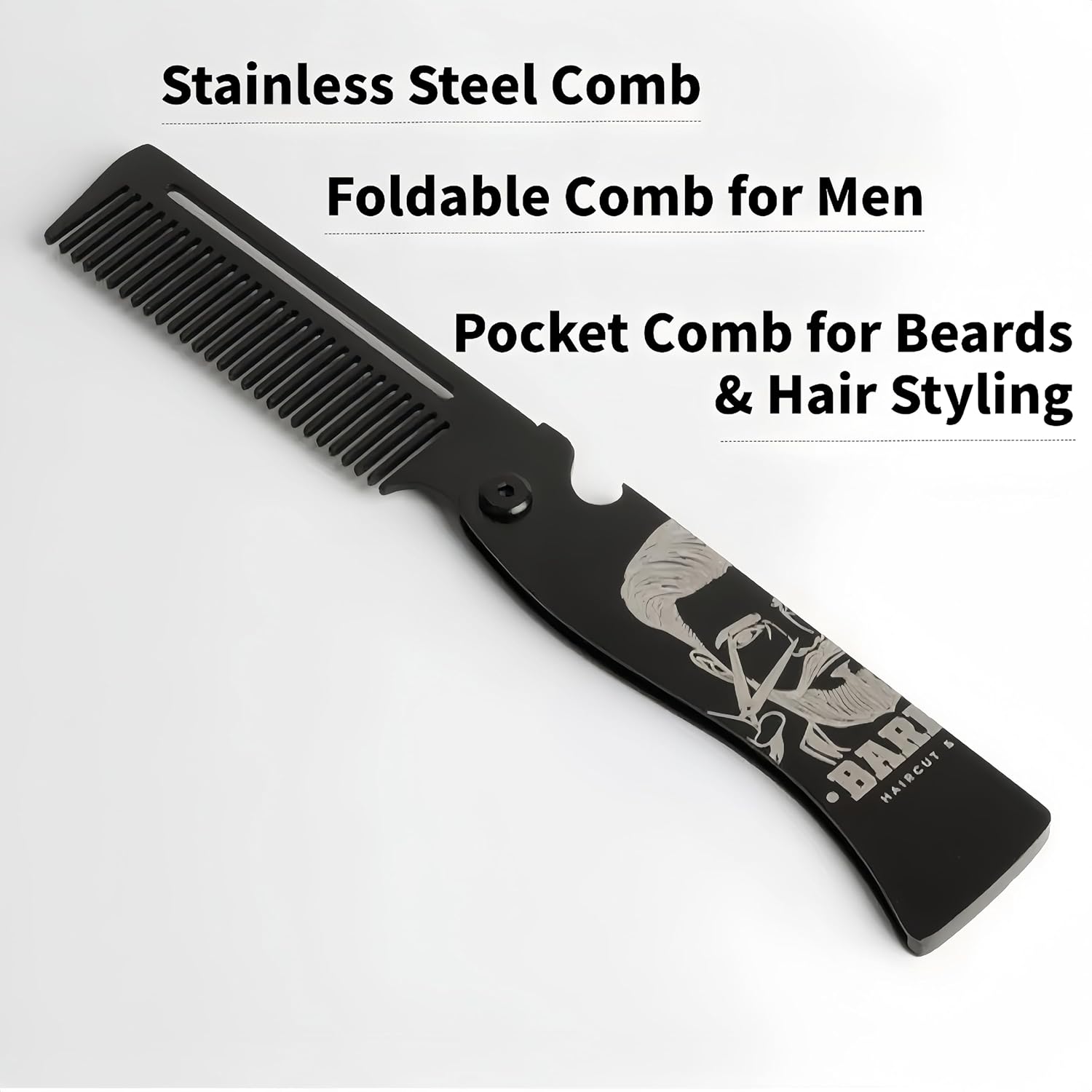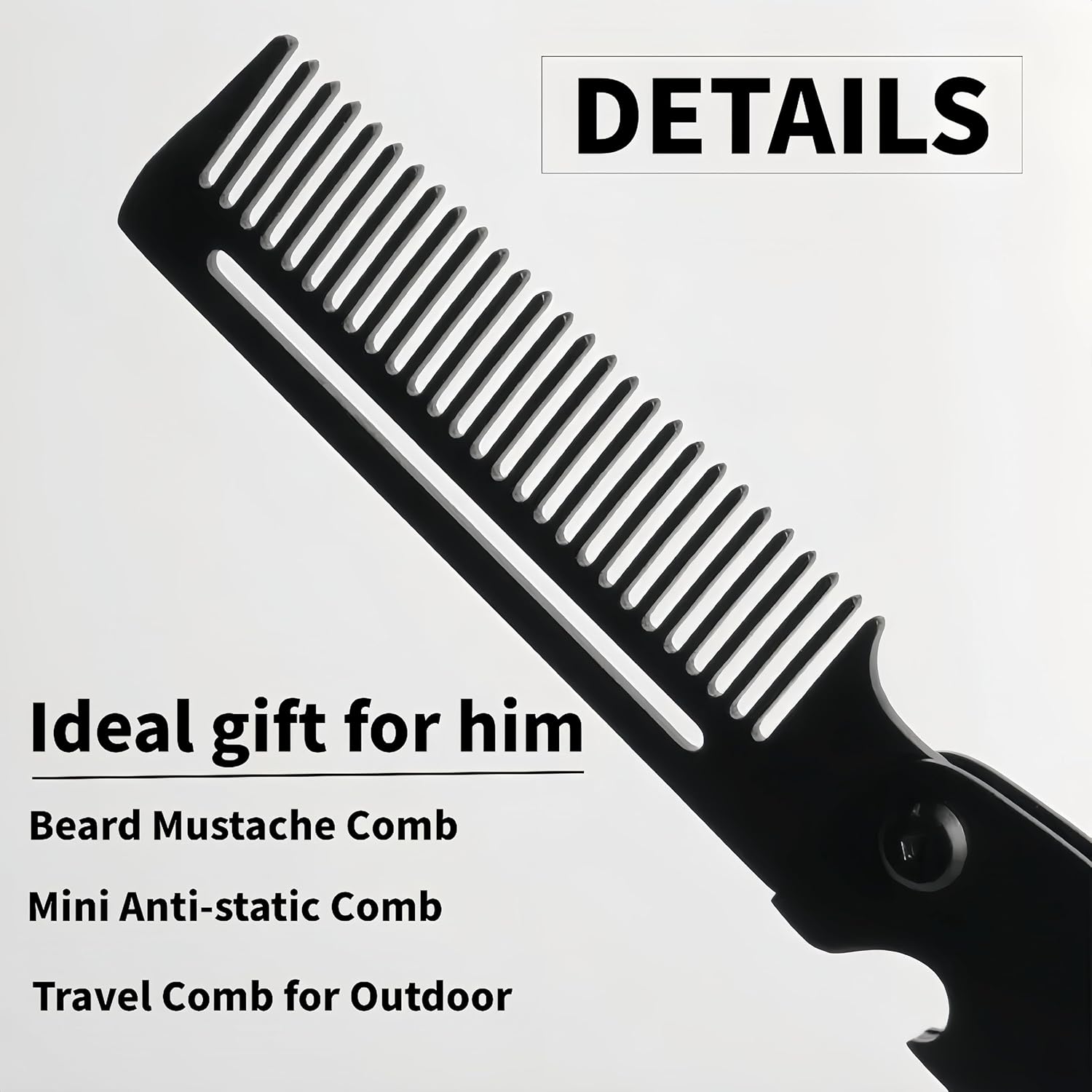 Men’s Metal Folding Pocket Beard & Mustache Comb, EDC Knife Comb with Bottle Opener for Outdool Travel – Anti-Static for Hair Styling Pompadour, Slicked-back, Fauxhawk, Undercut – Black