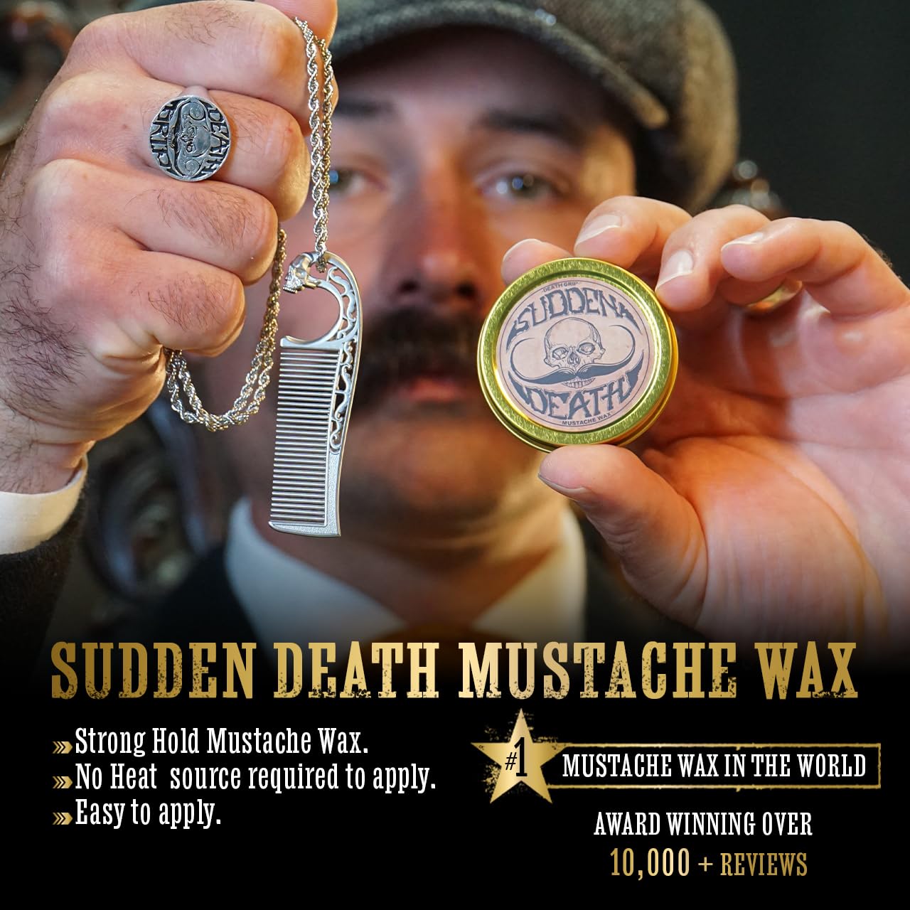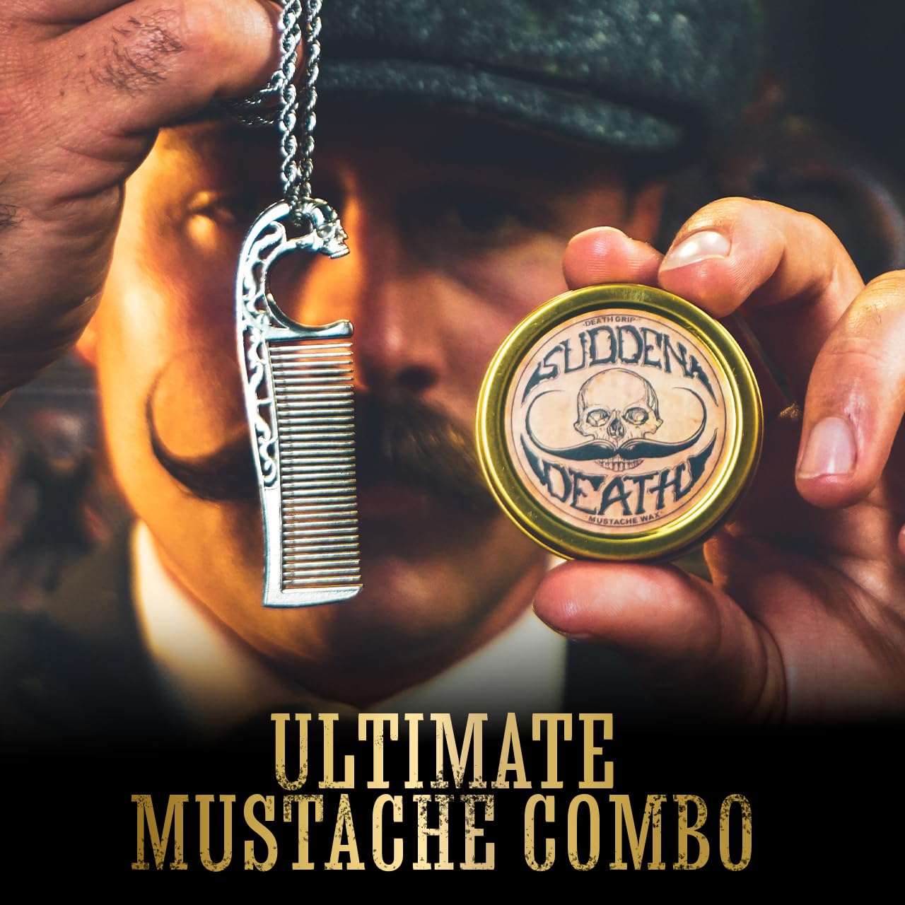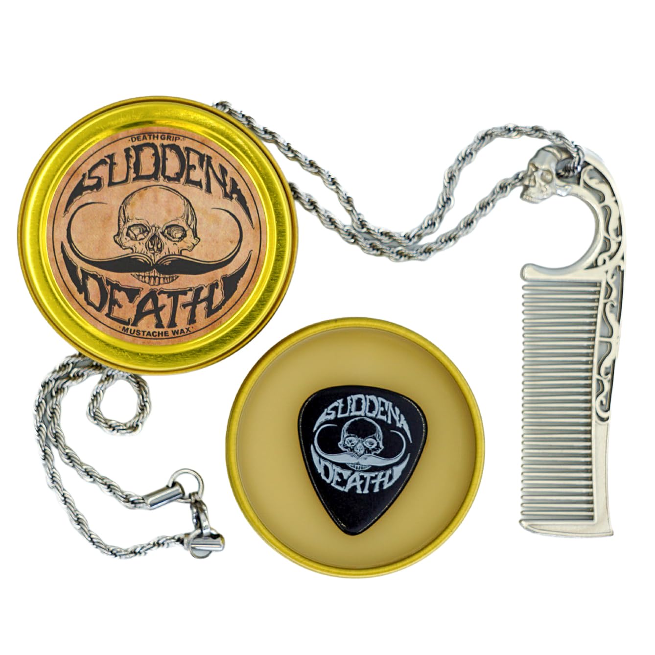Mustache Wax Strong Hold No Heat Required Sudden Death 1 oz Tin & Necklace Death Grip Mustache Comb Mens Combo Kit – Grooming For Men Handlebar Moustache