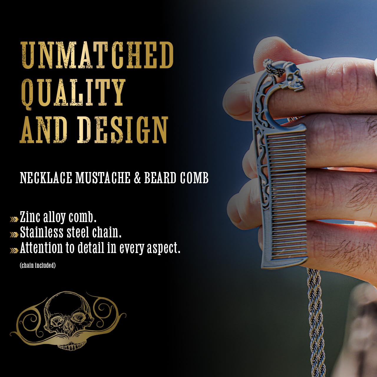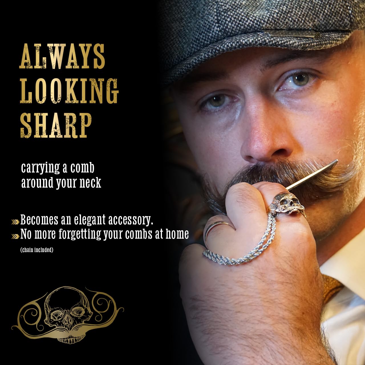 – Precision metal mustache comb on a necklace for easy access