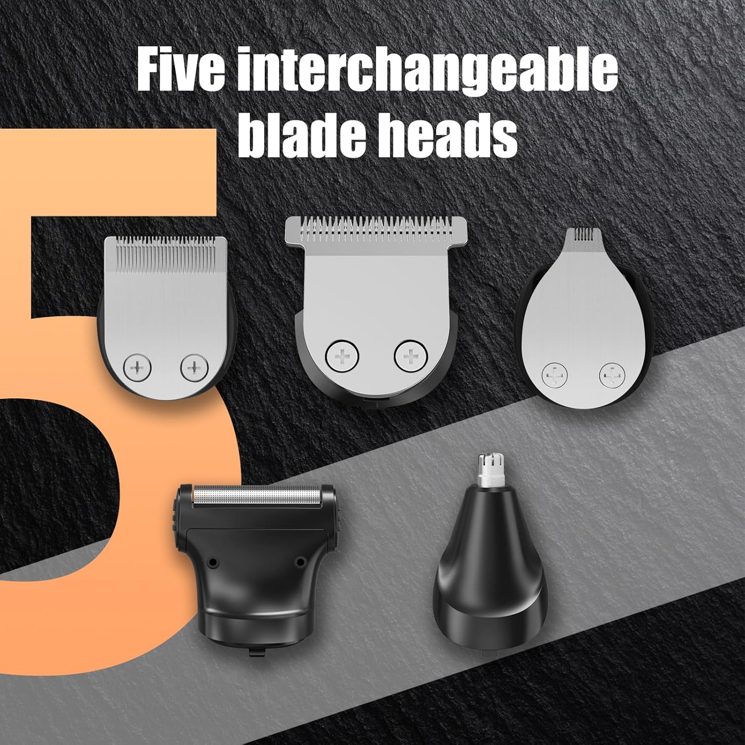 – 5 versatile trimmer heads for shaping face, beard, mustache, nose hair, and sensitive areas