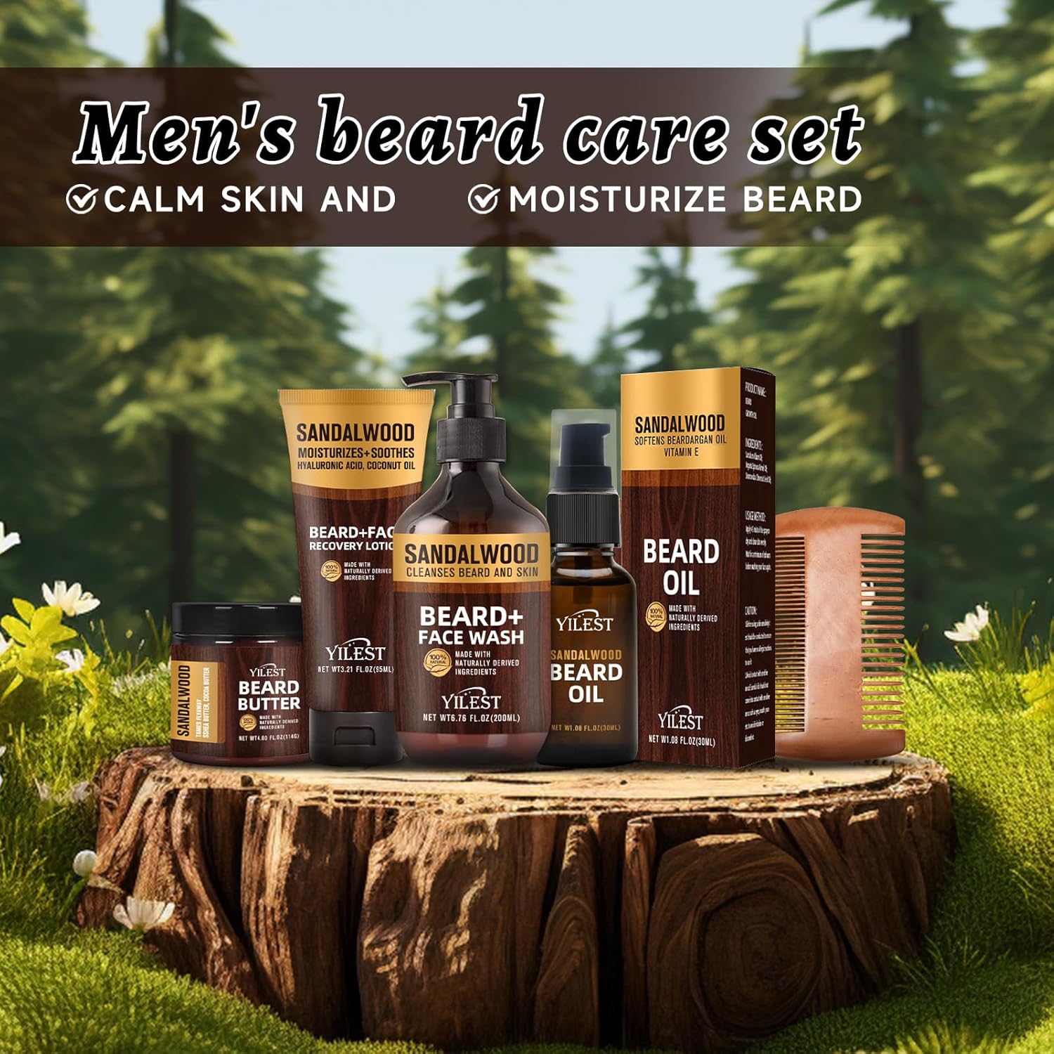 – Includes beard comb, beard butter, facial recovery lotion, beard and facial wash, and sandalwood beard oil