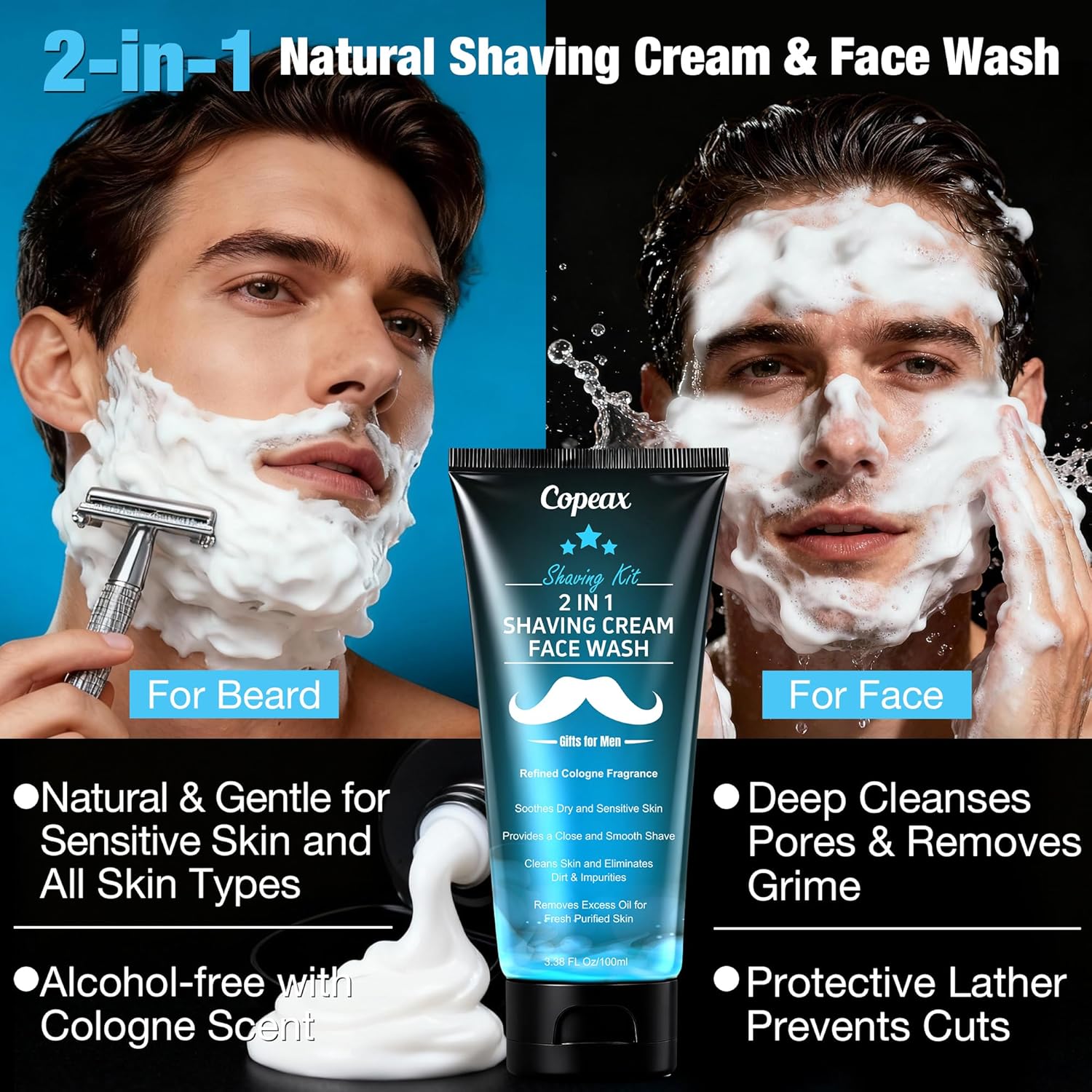 The Copeax All-in-One Shaving Kit is a complete set designed to give men a luxurious and comfortable shaving experience. From the 2-in-1 Shaving Cream & Face Wash to the inspirational Coffee Tumbler, this kit has everything you need for a silky-smooth shave. Infused with a refreshing cologne scent, this set not only pampers your skin but also boosts your confidence.