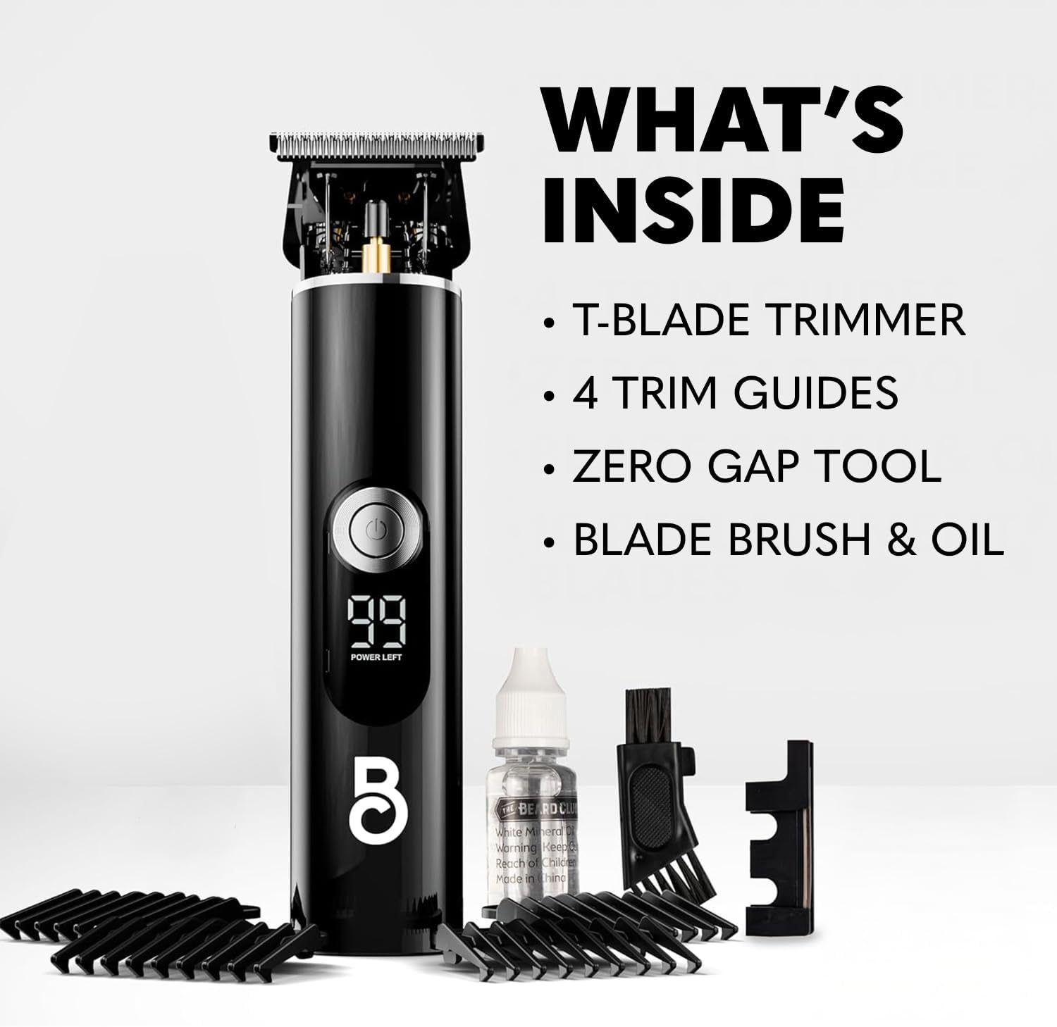 - Titanium-coated T blade trimmer with 4 guide options (1 | 1.5 | 2 | 3mm)