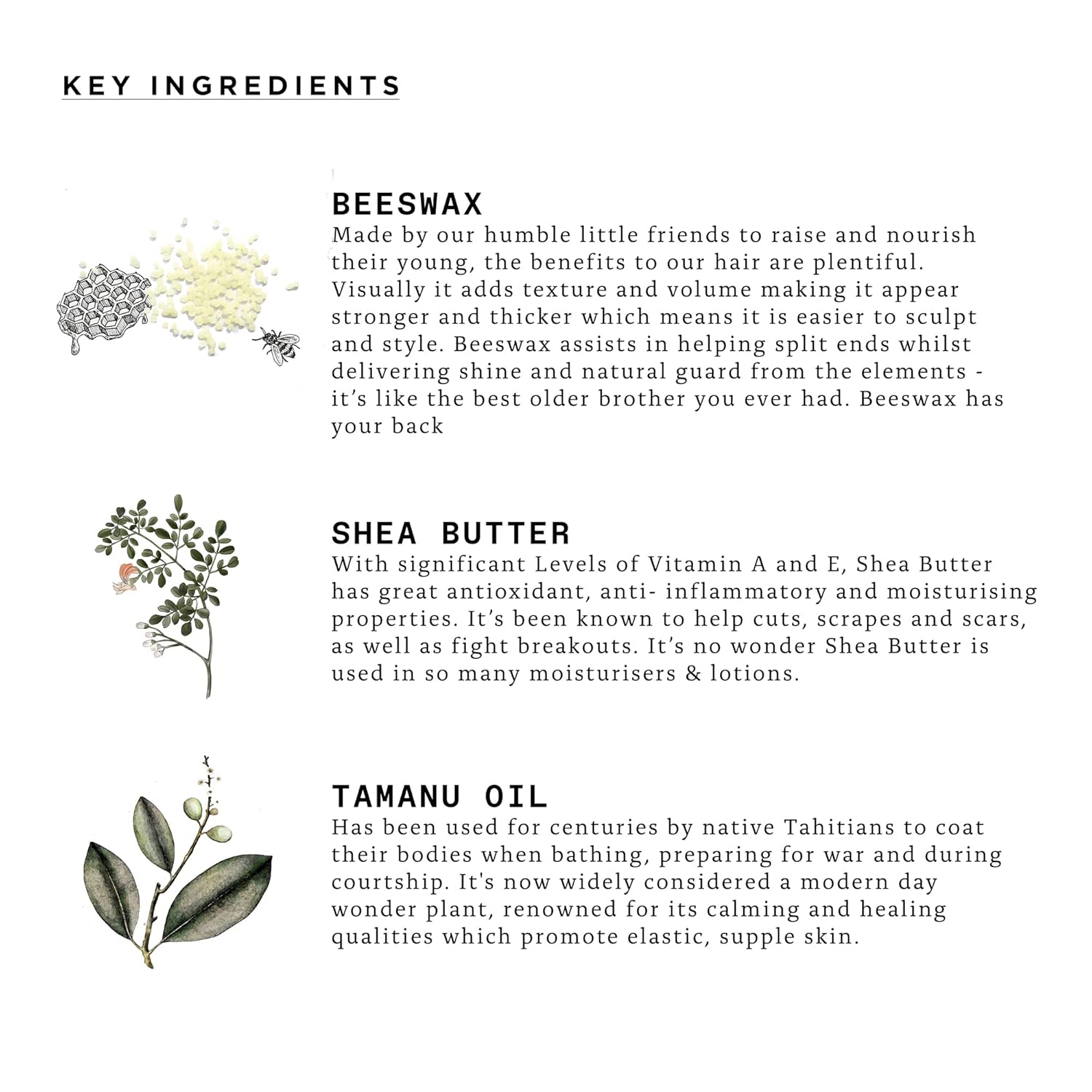 • Ingredients: Beeswax, Shea Butter, Tamanu Oil, Jojoba Seed Oil, and more